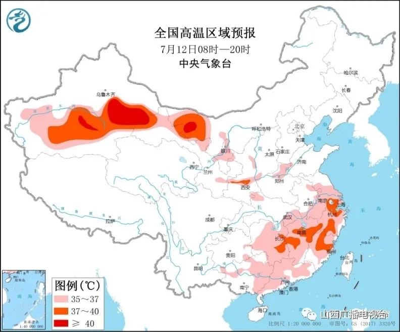 未来三天,江南、华南、江淮中东部、新疆等地高温天气持续,其中,7月12日白天,新疆南疆盆地、内蒙古西部、陕西关中以及江南大部、华南中东部等地有35℃以上高温天气,其中,新疆南疆盆地、内蒙古西部及浙江北部和西南部、福建中北部、江西中部、湖南东南部等地的部分地区最高气温37~39℃,局地可达到或超过40℃。中央气象台7月11日18时继续发布高温黄色预警。