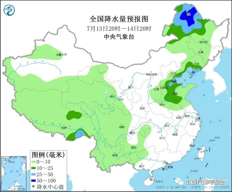 7月13日20时至14日20时,内蒙古东部、黑龙江西部、辽宁南部、华北东部、黄淮中部等地部分地区有中到大雨,其中,内蒙古东北部、黑龙江西北部等地部分地区有暴雨(50~60毫米)(见图5)。