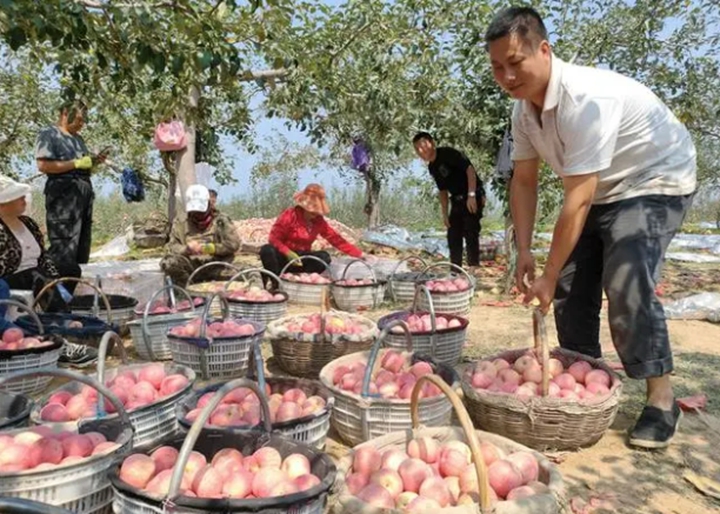 近日,陕西延安的果园里,果农们正忙着采摘装箱,一派丰收的喜人景象。