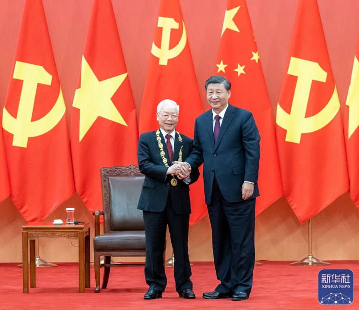 习近平发表讲话。习近平指出,阮富仲总书记是坚定的马克思主义者,是中国共产党的亲密同志和真诚朋友。在阮富仲总书记高度重视和亲自推动下,中越两党两国传统友谊得到巩固,政治互信不断增强,务实合作持续深化,交流互鉴日益密切。“友谊勋章”代表了中国共产党和中国人民对阮富仲总书记和越南人民的友好感情,象征着中越“同志加兄弟”的深厚情谊,蕴含着两党和两国人民共同追求美好未来的殷切希望。