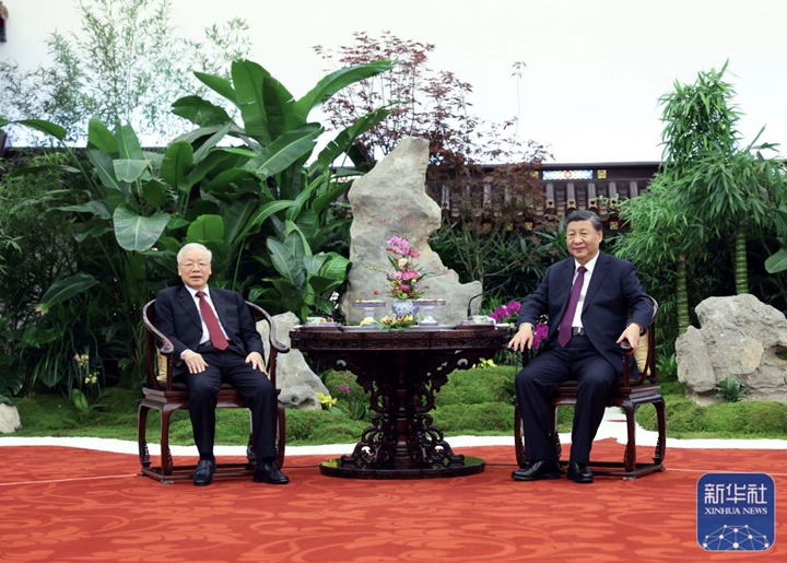 授勋仪式后,习近平同阮富仲进行了茶叙,畅叙两党两国传统友谊和发展前景。