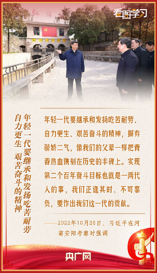 10月26日至28日,习近平总书记在陕西延安、河南安阳考察时强调,要大力弘扬自力更生、艰苦奋斗的精神。这是党的二十大后,习近平总书记首次国内考察。党的二十大召开期间,总书记也突出强调要坚定历史自信,增强历史主动,在新征程上团结奋斗,向着第二个百年奋斗目标进军。一起来学习!
