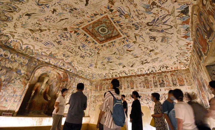 △7月10日,观众参观用数字技术复制的等比例敦煌莫高窟第285窟。