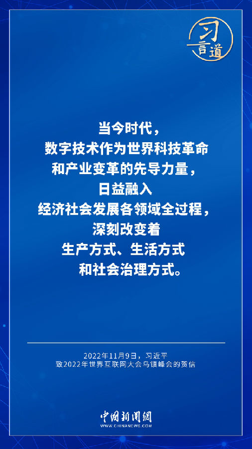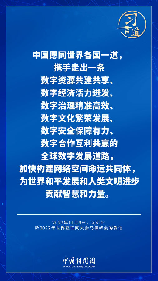 11月9日,国家主席习近平向2022年世界互联网大会乌镇峰会致贺信。