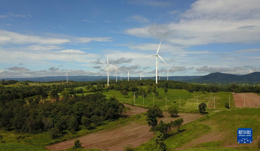 这是位于泰国猜也蓬府的由中国金风科技提供的风力发电机(2022年10月4日摄,无人机照片)。新华社发(塔纳摄)