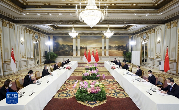 习近平指出,面对世纪疫情和百年变局,中新关系发展势头良好,不仅助力两国抗疫和经济复苏,而且为地区稳定和繁荣注入了正能量。中新关系具有前瞻性、战略性和示范性。中共二十大对中国全面建设社会主义现代化国家、全面推进中国式现代化作出了战略部署。中方愿同新方携手推动两国与时俱进的全方位合作伙伴关系不断取得新进展。