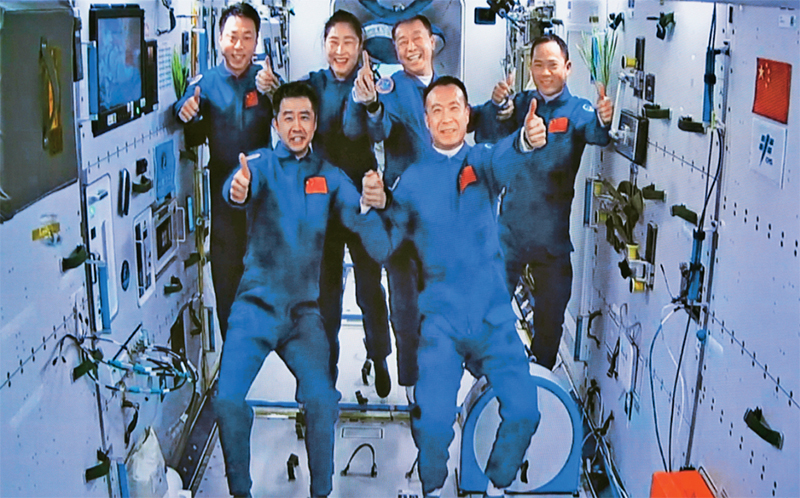 图为2022年11月30日在酒泉卫星发射中心拍摄的神舟十五号航天员乘组与神舟十四号航天员乘组太空合影的画面。 新华社记者 郭中正/摄