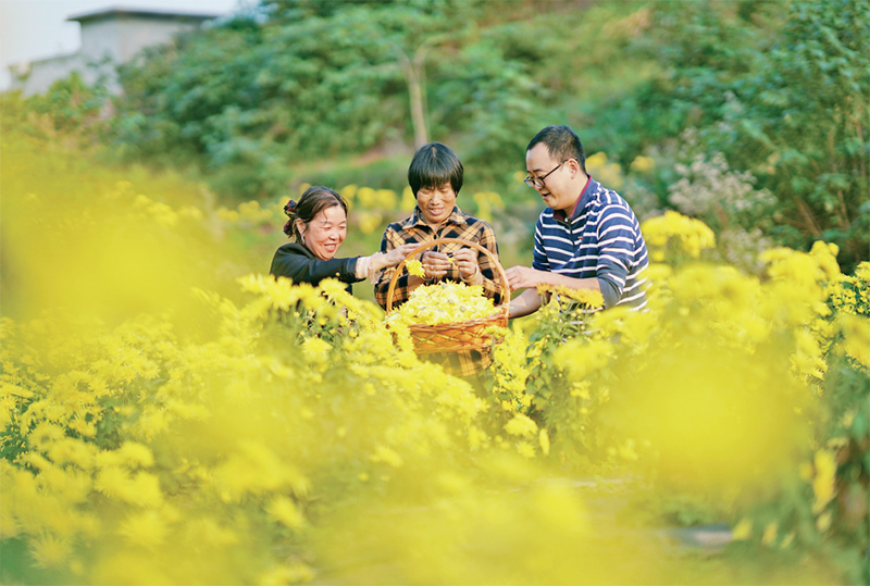 自长江流域重点水域“十年禁渔”以来,四川省泸州市积极稳妥推进禁捕退捕和渔民安置保障工作。图为2022年11月3日,在泸州市龙马潭区胡市镇黄桷村,联村干部(右一)向退捕转产渔民了解金丝皇菊产销情况,收集产业发展建议。 人民图片 舒雯/摄