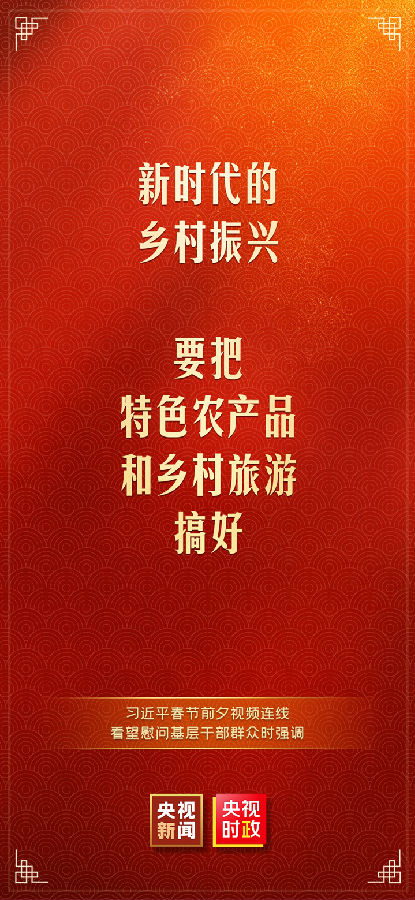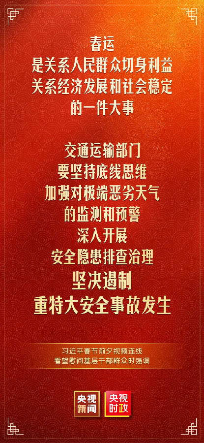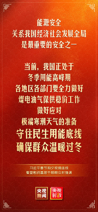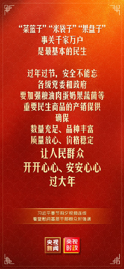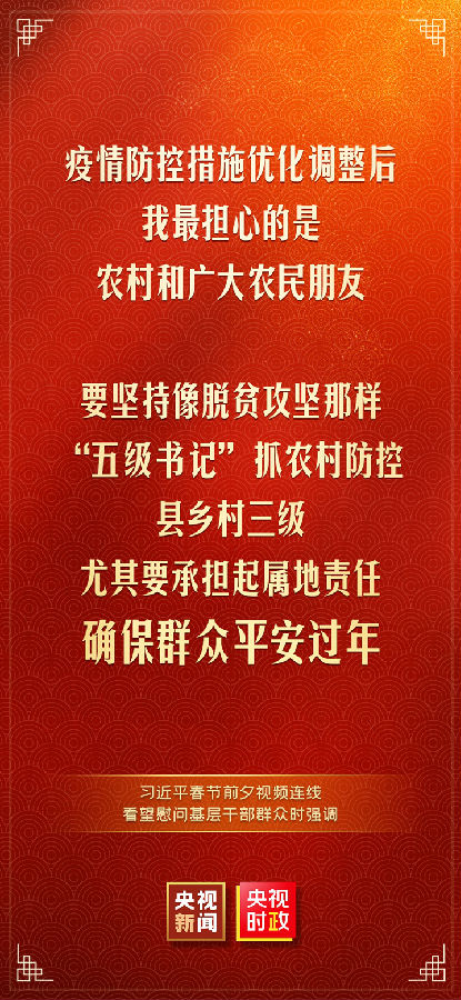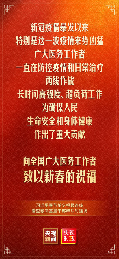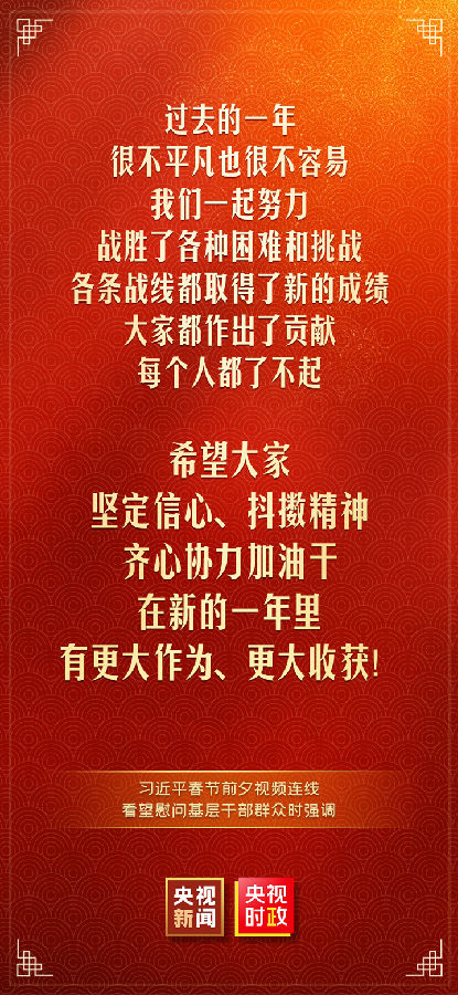 中华民族传统节日春节即将到来之际,中共中央总书记、国家主席、中央军委主席习近平通过视频连线看望慰问基层干部群众,向全国各族人民致以新春的美好祝福,祝各族人民身体健康、阖家幸福、事业进步、兔年吉祥!祝愿伟大祖国繁荣昌盛、国泰民安!