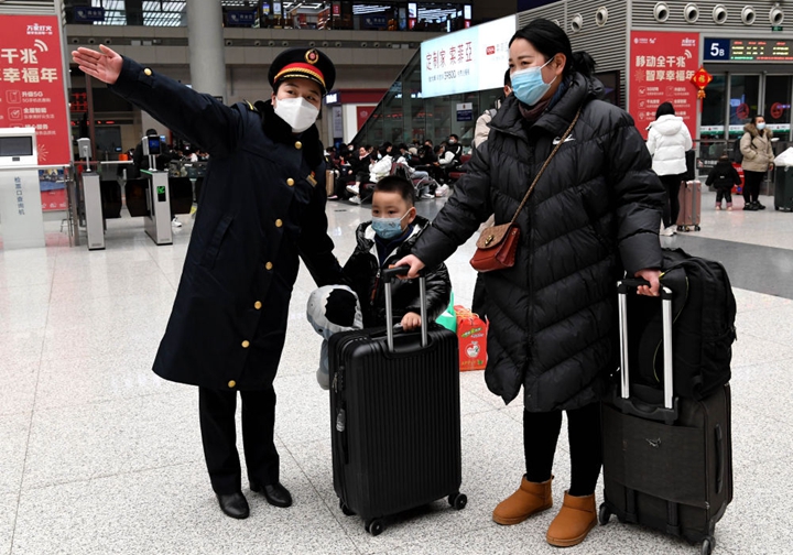 1月18日,郑州东站客运值班员张华(左)在候车大厅内引导旅客。新华社记者 李安 摄