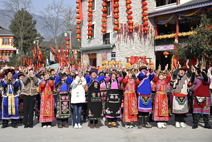 1月18日,四川省绵阳市北川羌族自治县石椅村的乡亲们和游客同习近平总书记视频连线。新华社记者 殷博古 摄
