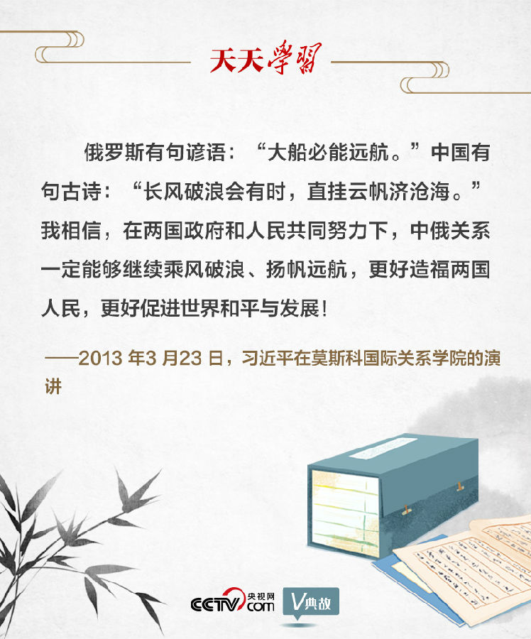 关于中俄关系,早在10年前在莫斯科国际关系学院的演讲中,习近平主席就有精辟阐述。演讲结束语中,习主席首先引用一句俄罗斯谚语“大船必能远航”,拉近了与俄罗斯民众的文化空间和心理距离。接着引用了含义相近的中国古诗“长风破浪会有时,直挂云帆济沧海”,让对方在文化相似性中深刻领悟其中道理。最后凝聚共同理念:“中俄关系一定能够继续乘风破浪、扬帆远航”。