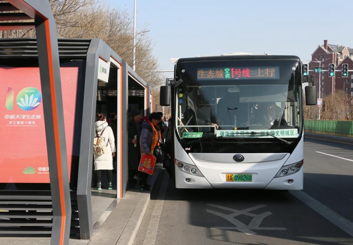 乘客在中新天津生态城的一座智慧公交站乘坐免费的纯电动公交车。