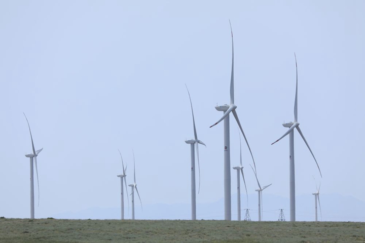 图为2021年5月24日在哈萨克斯坦扎纳塔斯拍摄的风电场的风机。新华社发(奥斯潘诺夫摄)