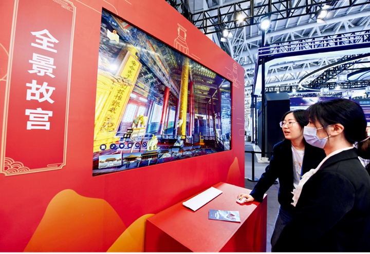 2023年4月26日,第六届数字中国建设成果展览会在福州开幕。图为市民通过数字应用场景观看全景故宫。