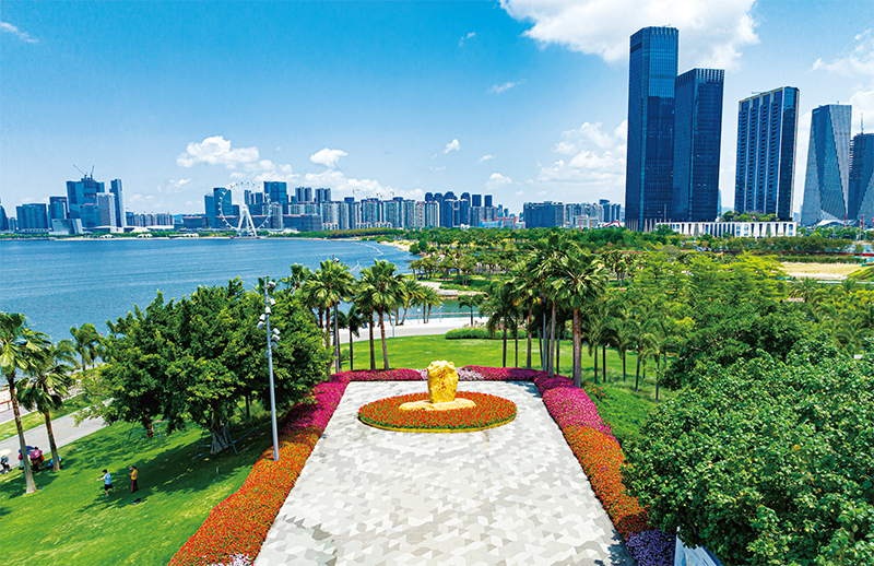 支持深圳建设中国特色社会主义先行示范区,是以习近平同志为核心的党中央作出的重大决策,有利于率先探索全面建设社会主义现代化强国新路径,为实现中华民族伟大复兴的中国梦提供有力支撑。图为从深圳前海石公园眺望生机勃勃的前海湾。 深圳市前海管理局供图