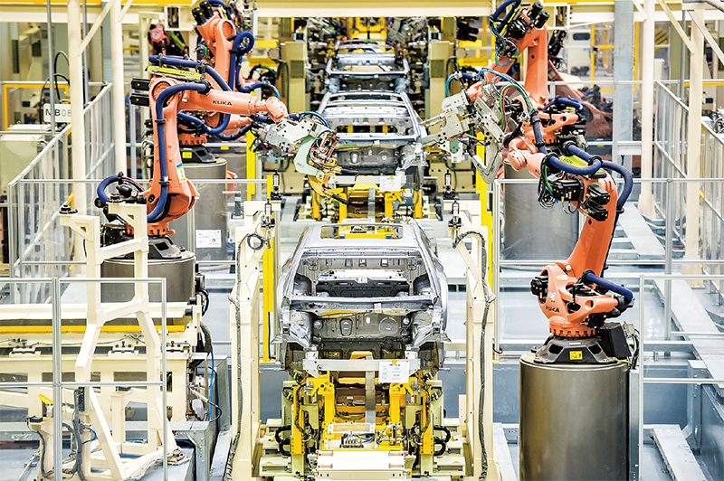 发展新能源汽车是我国从汽车大国迈向汽车强国的必由之路。2022年中国新能源汽车产销分别实现705.8万辆和688.7万辆,连续8年位居世界第一。图为广汽埃安第一智造中心焊装车间正在热火朝天地生产。 广汽埃安新能源汽车股份有限公司供图