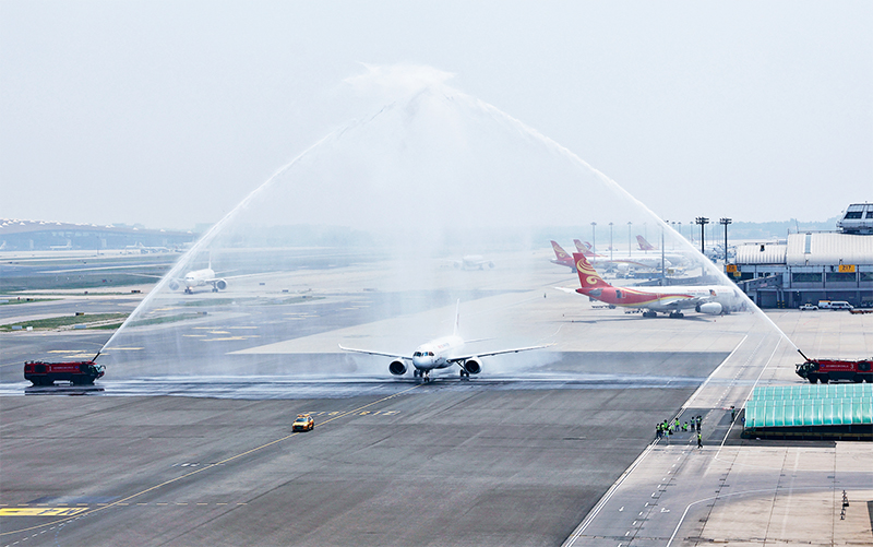 2023年5月28日,国产大型客机C919圆满完成首次商业飞行,开启市场化运营、产业化发展新征程。图为北京首都国际机场以水门礼迎接C919首个商业航班东航MU9191。 新华社发 魏萌/摄