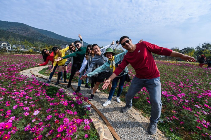 2019年11月6日,外国游客在湖州市长兴县小浦镇的千亩花海中合影。(徐昱 摄)