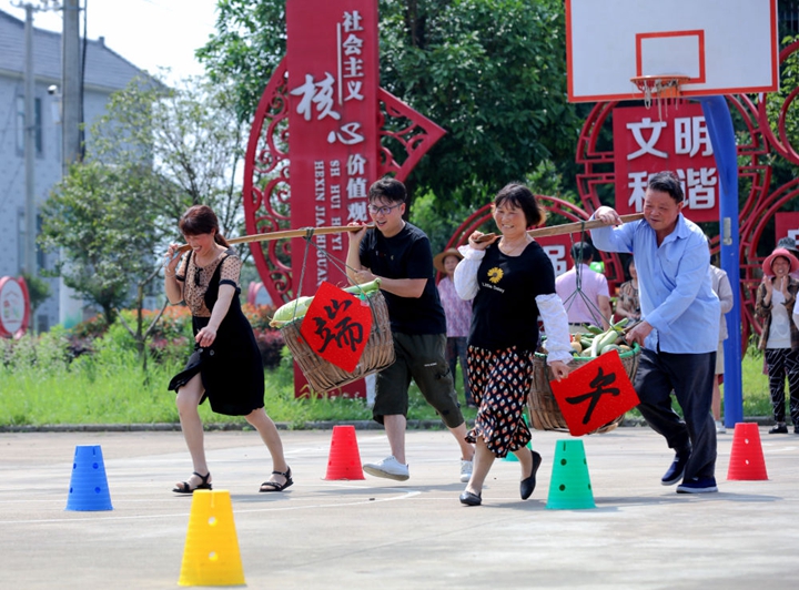 2023年6月21日,在湖州市长兴县和平镇长岗村文化礼堂前广场,当地村民正在进行挑担子绕障碍物比赛。(徐昱 摄)