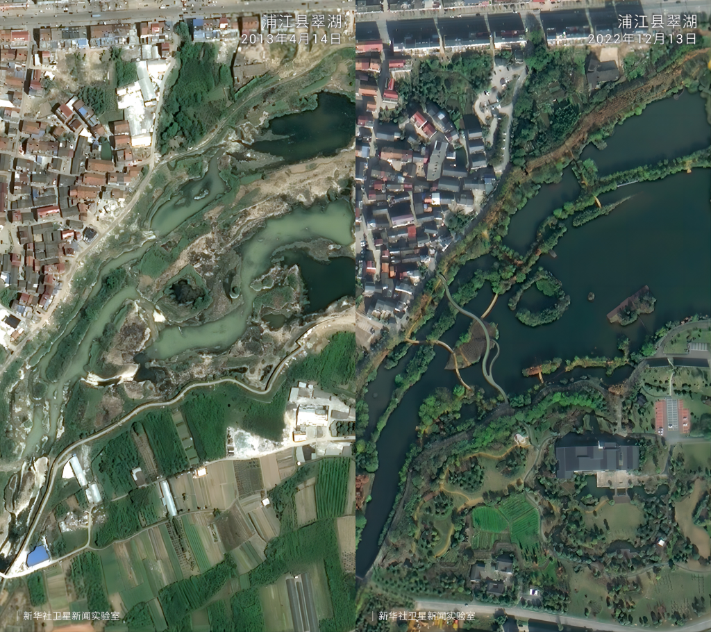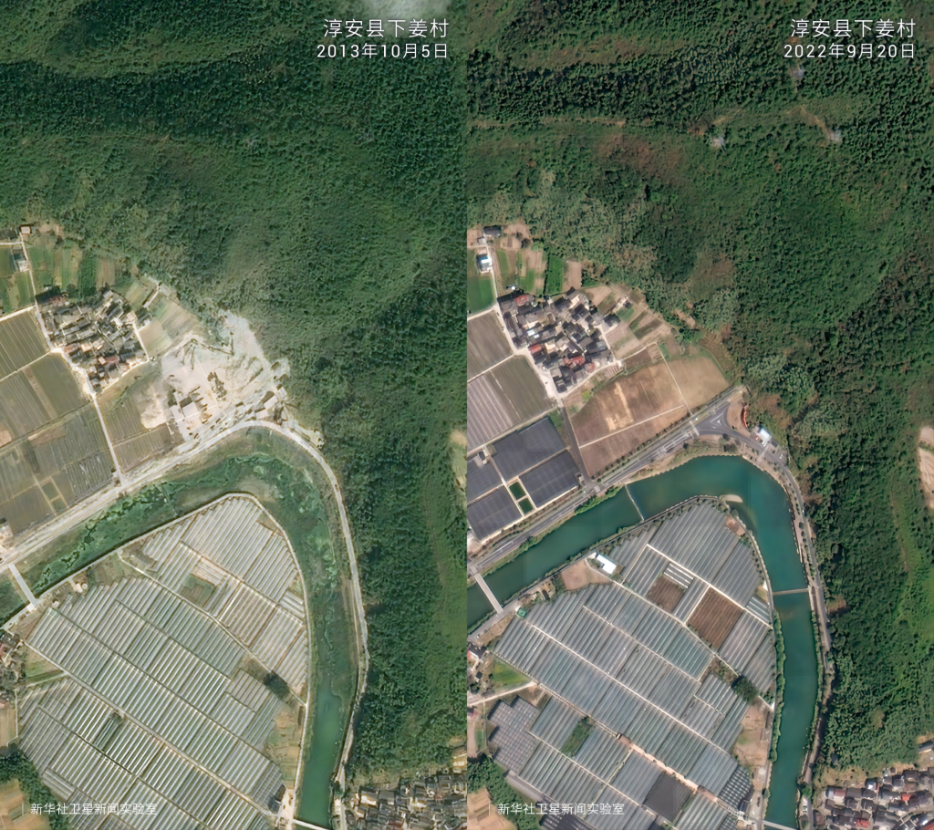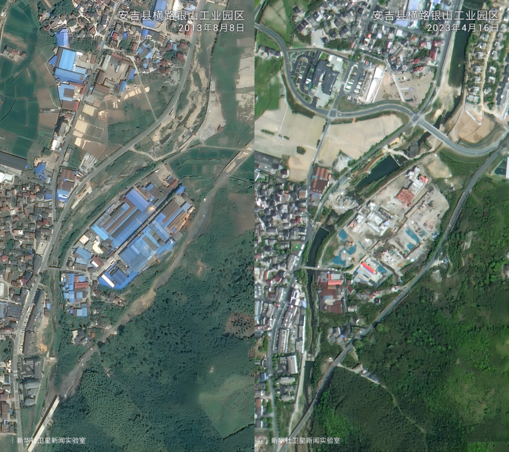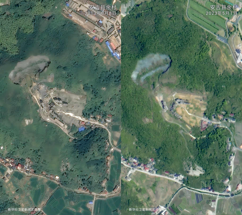 在“绿水青山就是金山银山”理念指引下,20年来浙江省安吉县余村完成了从水泥厂、矿山遍布到“人在余村走、就是画中游”的精彩蝶变。卫星云图中的大片灰色如今已被满目绿色所覆盖,从“工业飞鸟”到“生态田园”,余村百姓看到了美景,富足了精神。