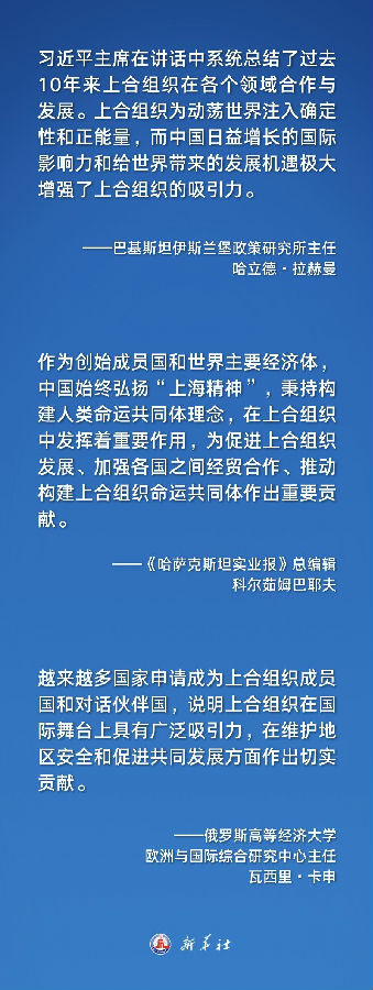 巴基斯坦伊斯兰堡政策研究所主任哈立德·拉赫曼说,习近平主席在讲话中系统总结了过去10年来上合组织在各个领域合作与发展。上合组织为动荡世界注入确定性和正能量,而中国日益增长的国际影响力和给世界带来的发展机遇极大增强了上合组织的吸引力。
