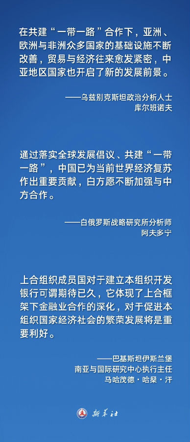 对于习近平主席提出的“扩大本组织国家本币结算份额”“建立本组织开发银行”等建议,巴基斯坦伊斯兰堡南亚与国际研究中心执行主任马哈茂德·哈桑·汗说,上合组织成员国对于建立本组织开发银行可谓期待已久,它体现了上合框架下金融业合作的深化,对于促进本组织国家经济社会的繁荣发展将是重要利好。