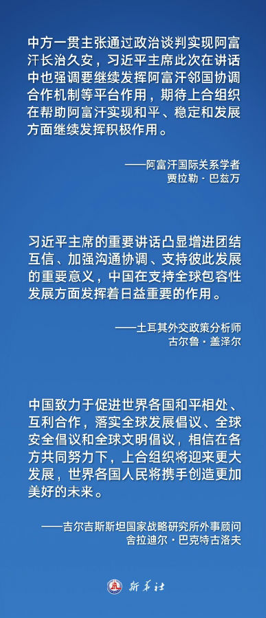 国际社会普遍认为,习近平主席的重要讲话将促进上合组织成员国增进团结互信、维护地区和平、聚焦务实合作、加强交流互鉴、完善全球治理,推动上合组织不断发展壮大,为维护世界和平与发展注入更多确定性和正能量。