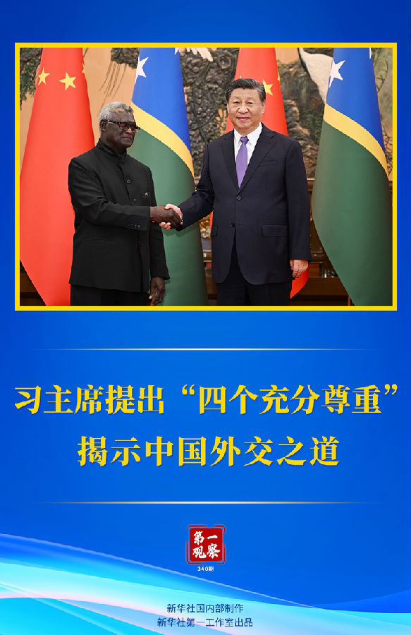 7月10日下午,国家主席习近平在人民大会堂会见来华进行正式访问的所罗门群岛总理索加瓦雷。会见中,习近平主席指出,中国的太平洋岛国政策秉持“四个充分尊重”——