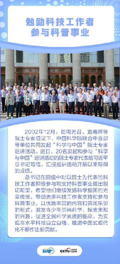 7月20日,习近平总书记给“科学与中国”院士专家代表回信。他在回信中强调,科学普及是实现创新发展的重要基础性工作,并对科技工作者支持和参与科普事业提出殷切期望。