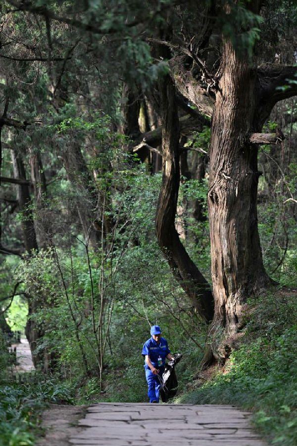 日前,一名清洁人员在四川省广元市剑阁县翠云廊景区捡拾枯枝落叶。新华社记者 刘坤 摄