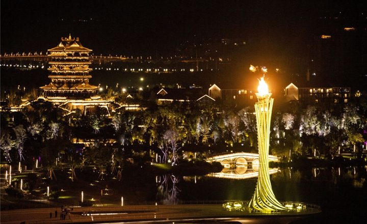 主火炬塔的火焰熊熊燃烧,照亮了全人类追求和平与发展的共同愿望,照亮了构建人类命运共同体的共同梦想!