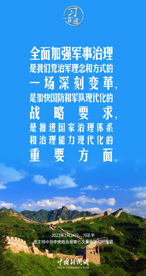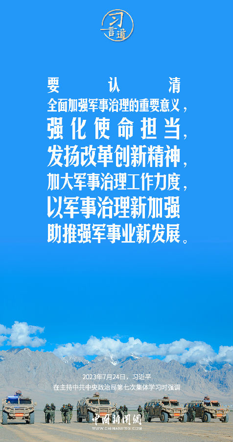 八一建军节来临之际,中共中央政治局7月24日下午就全面加强军事治理进行第七次集体学习。中共中央总书记习近平主持学习,他强调——