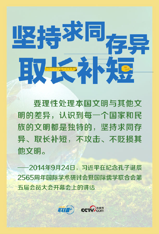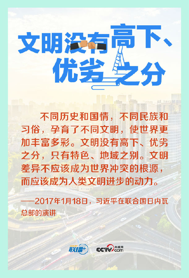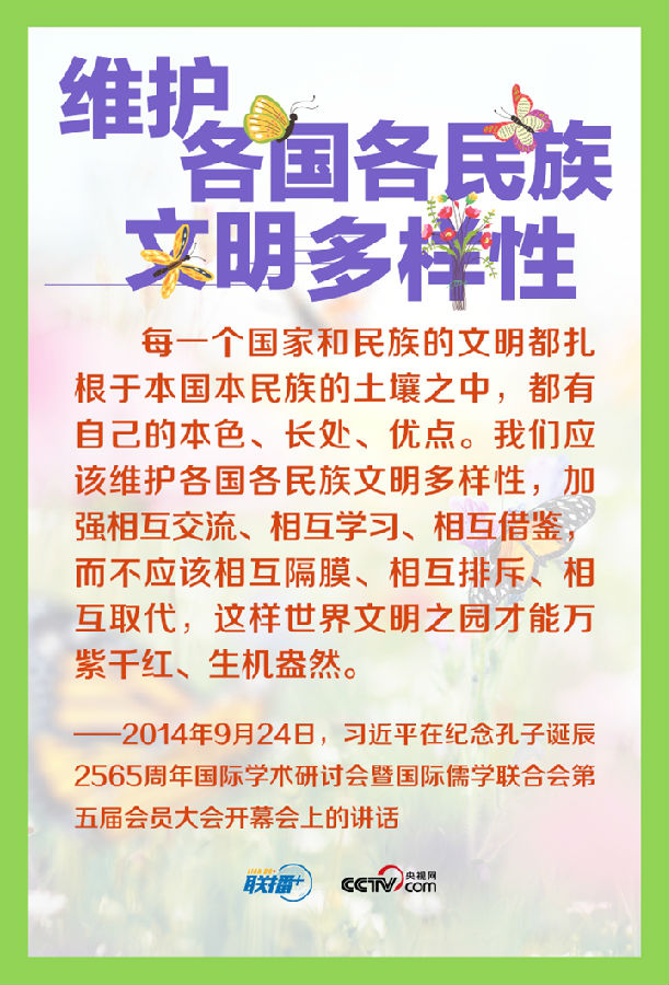 人类文明多样性赋予这个世界姹紫嫣红的色彩,多样带来交流,交流孕育融合,融合产生进步。长期以来,习近平主席在不同场合多次倡导尊重世界文明多样性,推动不同文明交流对话、和平共处、和谐共生。让我们一起来学习。