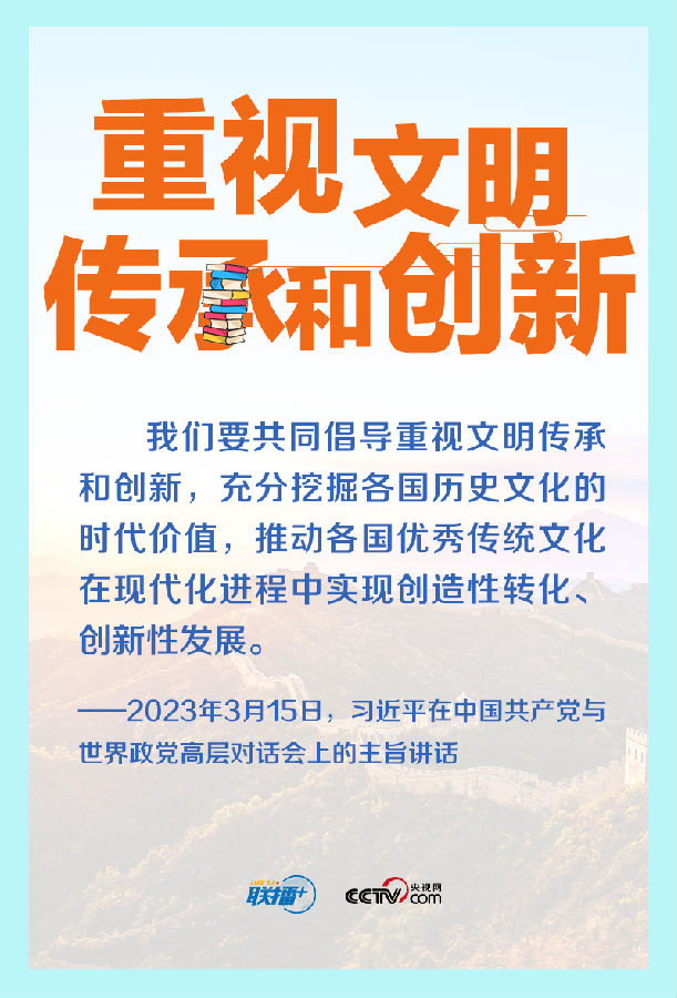 联播+ 重视文明传承和创新,是文明交流互鉴的动力源泉。2023年年初,习近平总书记在中国共产党与世界政党高层对话会上首次提出全球文明倡议,这是继全球发展倡议、全球安全倡议后,新时代中国为国际社会提供的新的国际公共产品。