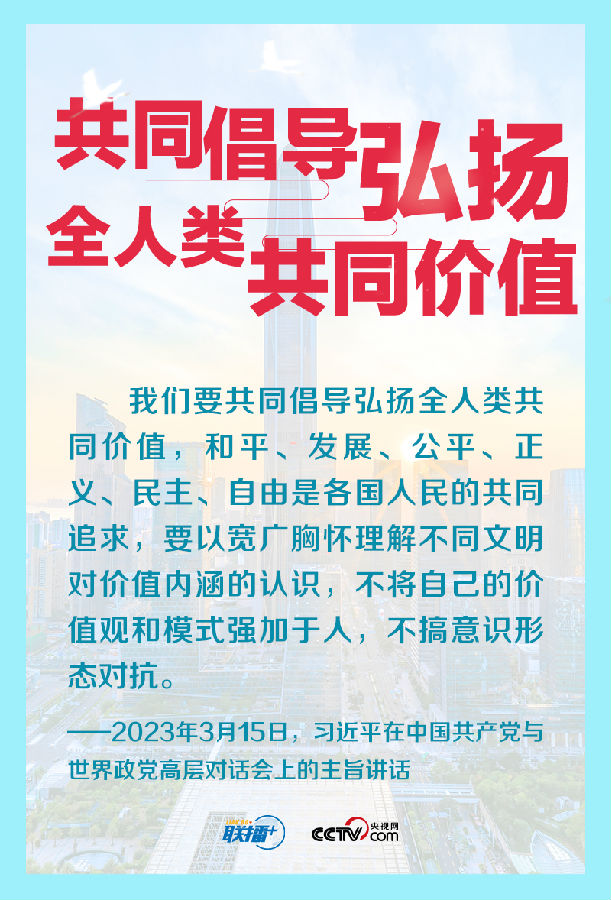 联播+“和平、发展、公平、正义、民主、自由,是全人类的共同价值,也是联合国的崇高目标。”2015年9月,习近平主席在第七十届联合国大会一般性辩论时,首次提出全人类共同价值并阐释其基本内涵。此后,在诸多重要双多边场合,他多次提及全人类共同价值,并深入阐释中方对这一价值理念的思考和行动。