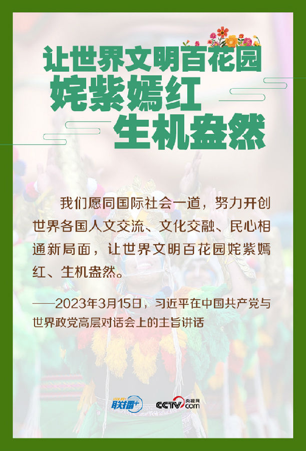 联播+ 2023年年初,习近平总书记在中国共产党与世界政党高层对话会上首次提出全球文明倡议。他强调,我们要共同倡导加强国际人文交流合作,探讨构建全球文明对话合作网络,丰富交流内容,拓展合作渠道,促进各国人民相知相亲,共同推动人类文明发展进步。