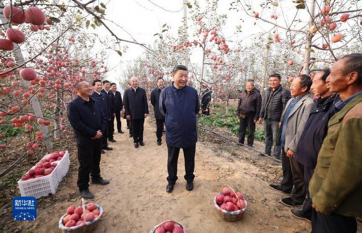 2022年10月26日至28日,中共中央总书记、国家主席、中央军委主席习近平在陕西省延安市、河南省安阳市考察。这是26日下午,习近平在延安市安塞区高桥镇南沟村苹果园同老乡们亲切交流。 新华社记者 鞠鹏摄