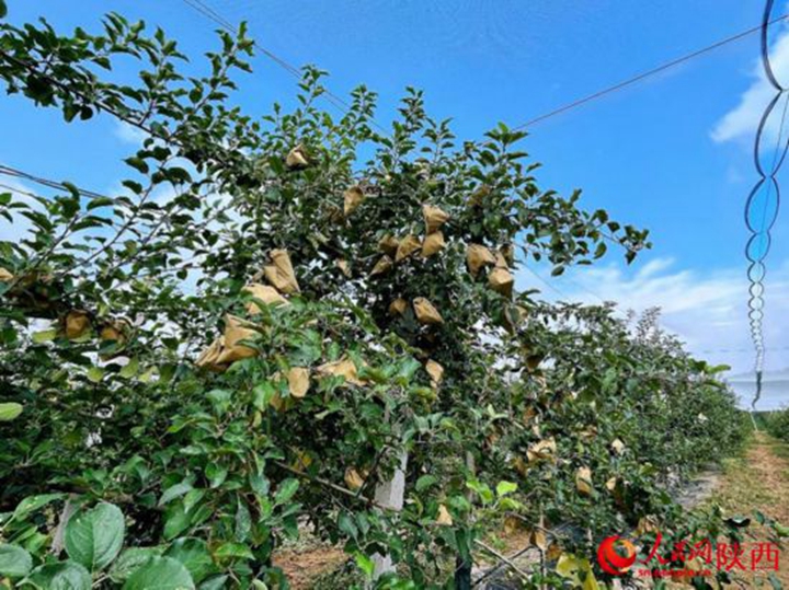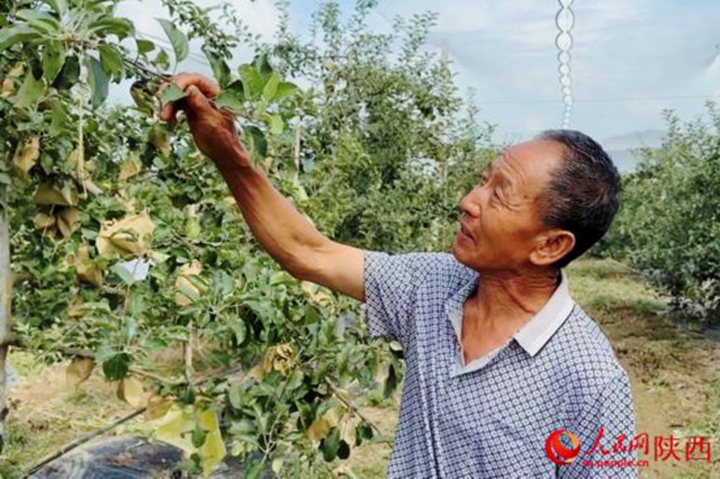 南沟村苹果矮化密植栽培示范园内。给苹果套袋,可以有效预防苹果病虫害、保持果皮细嫩光洁、降低果实农药残留。 人民网记者 魏鑫摄
