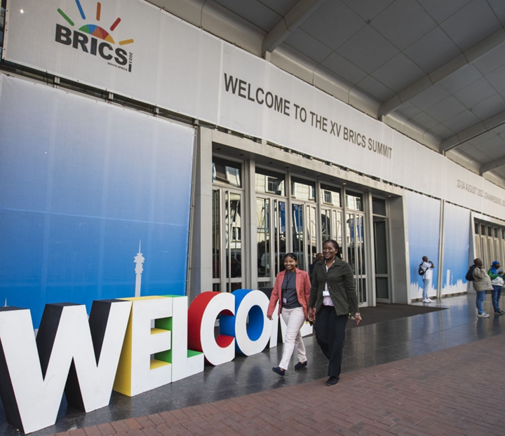 8月20日,在南非约翰内斯堡,行人走过金砖国家领导人第十五次会晤举办场所。新华社记者张誉东摄