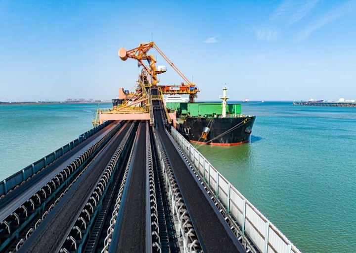 蔚蓝的渤海之畔,河北省沧州市黄骅港煤炭港区海风阵阵,货轮汽笛长鸣,乌黑的煤炭随着传送带滚滚向前,被伸展着“巨臂”的装船机源源不断地装载在停靠的货轮上,整个生产作业有条不紊。