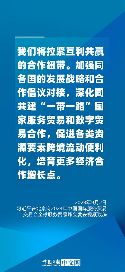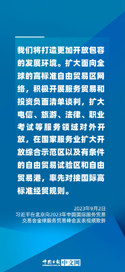 9月2日上午,国家主席习近平在北京向2023年中国国际服务贸易交易会全球服务贸易峰会发表视频致辞。