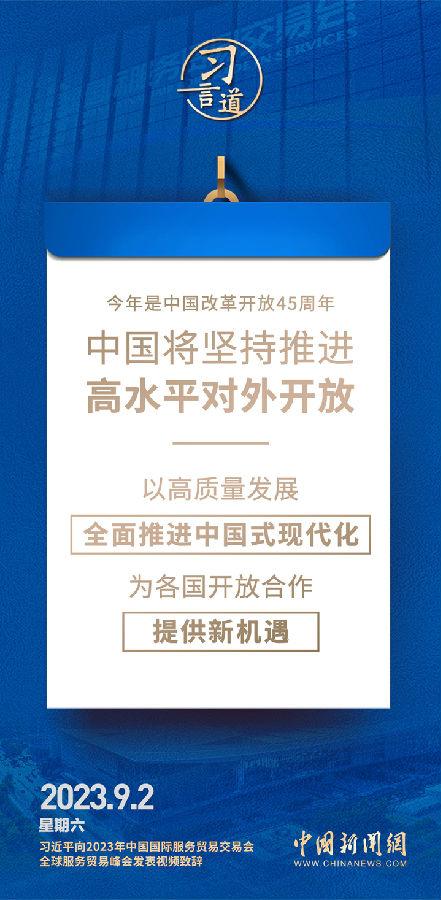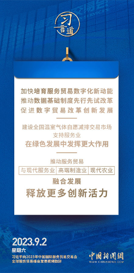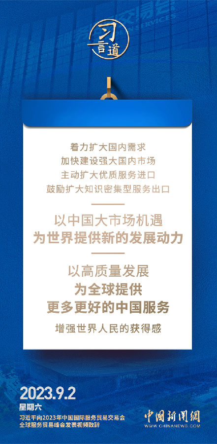 9月2日上午,国家主席习近平在北京向2023年中国国际服务贸易交易会全球服务贸易峰会发表视频致辞。习近平指出——