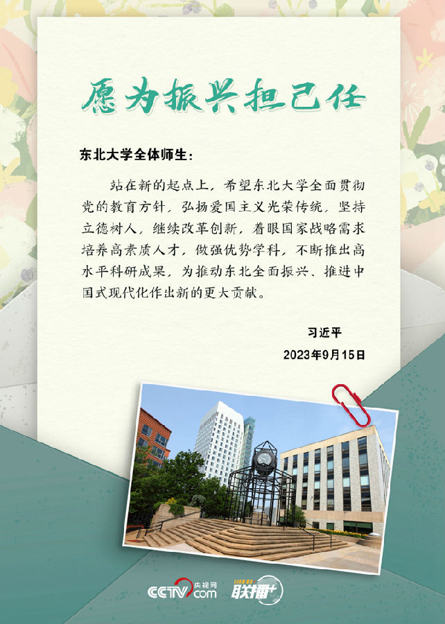 联播+ “东北大学自成立以来,始终以育人兴邦为使命,形成了鲜明办学特色,培养了大批优秀人才,为国家、为民族作出了积极贡献。”9月15日,习近平总书记给东北大学全体师生回信。