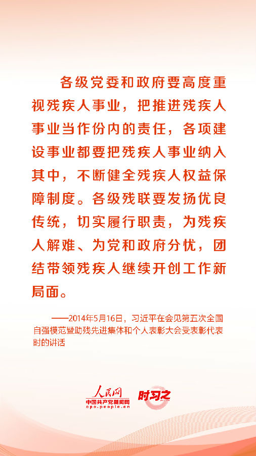 残疾人事业是“春天的事业”。对于发展这项事业,习近平总书记时时在心、屡屡部署。他表示“不断满足人民群众对美好生活的需要,必须保护好残疾人权益,残疾人事业一定要继续推动”。