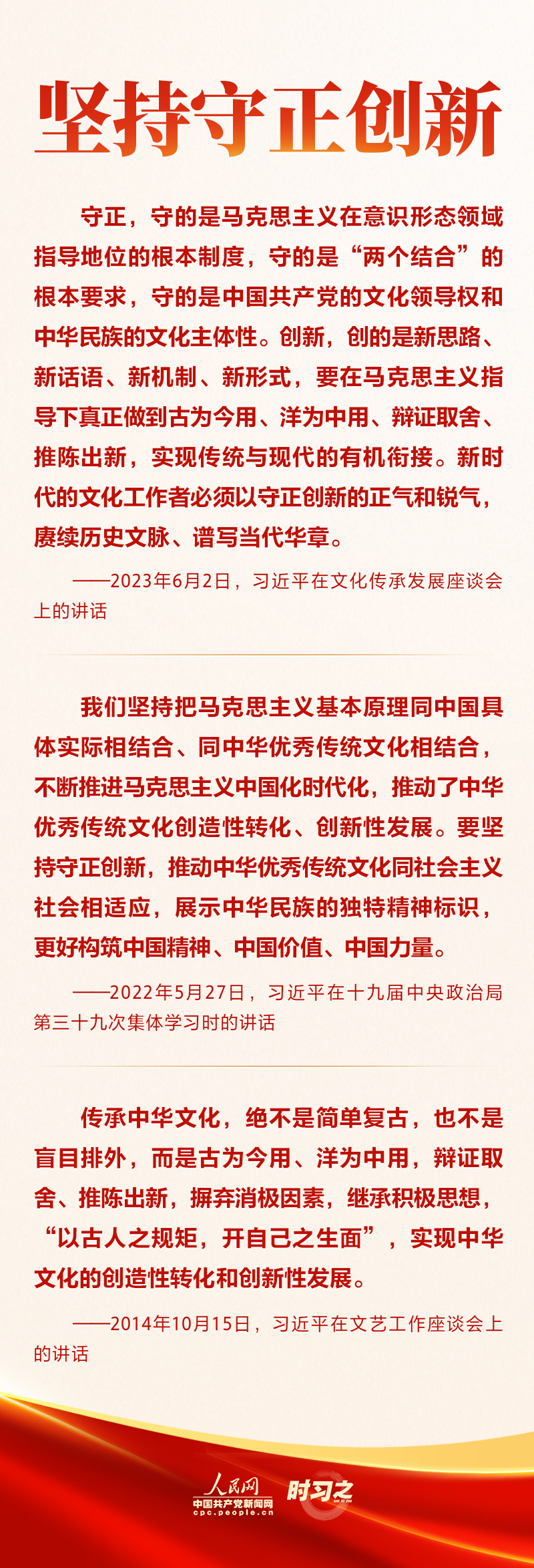 围绕在新的历史起点上继续推动文化繁荣、建设文化强国、建设中华民族现代文明这一新的文化使命,习近平总书记一以贯之强调要“坚定文化自信”“秉持开放包容”“坚持守正创新”。