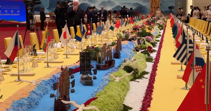 在10月17日晚举行的欢迎宴会上,嘉宾们被这样一个细节深深打动——晚宴餐台以“抚古观今、拥抱未来”为主题,南侧展示着古代丝绸之路的微观景象:海边码头上摆放着对外出口的瓷器、丝绸、茶叶等贸易物资,路上摆放有从西域引进的蔬菜瓜果;餐台北侧为21世纪丝绸之路的景观:以北京天坛的装饰为起点,中间穿插高铁、中欧班列、新能源汽车等摆件,展现各国互联互通的景象……