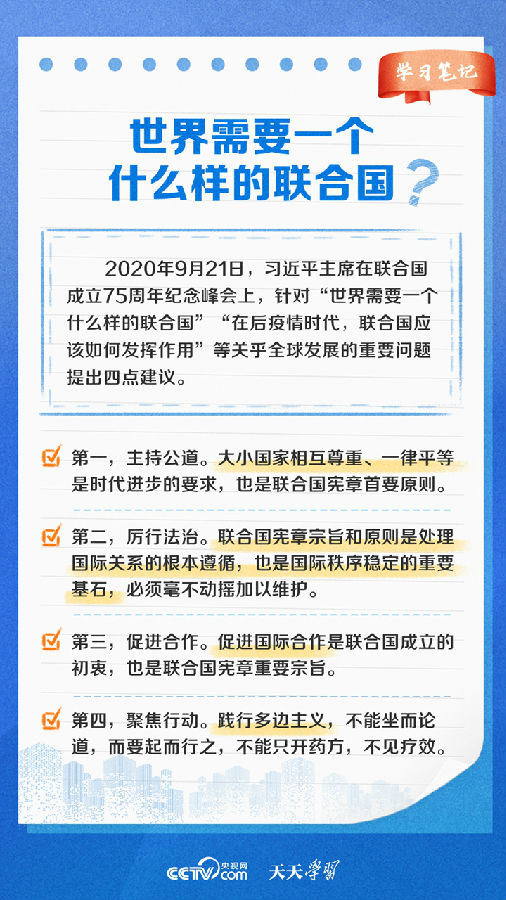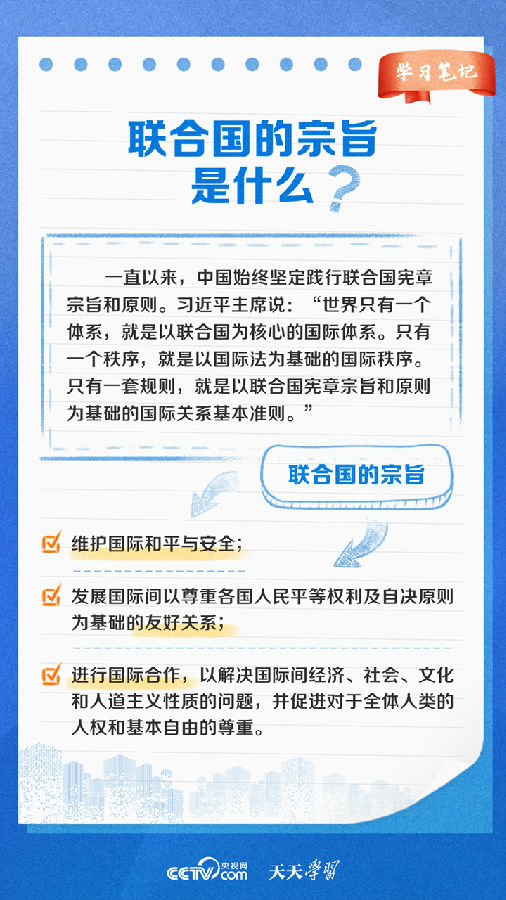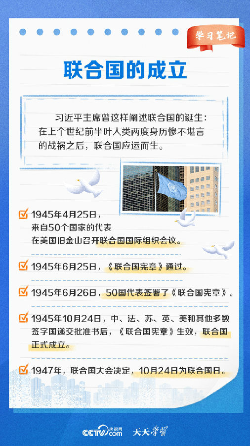 天天学习 1945年10月24日,《联合国宪章》正式生效,联合国宣告成立,为国际关系发展开启了新篇章。作为世界上最具普遍性、代表性、权威性的政府间国际组织,联合国坚持推进多边主义,为维护世界和平、促进共同发展发挥了不可替代的作用。