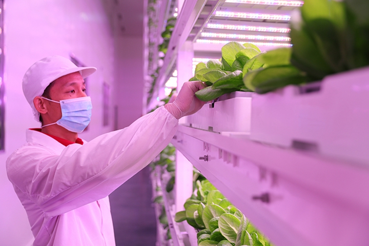 2018年6月15日,福州一家企业的技术人员正在查看蔬菜生长情况。
