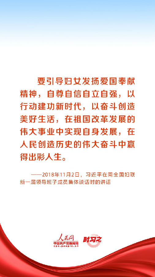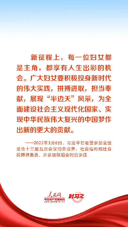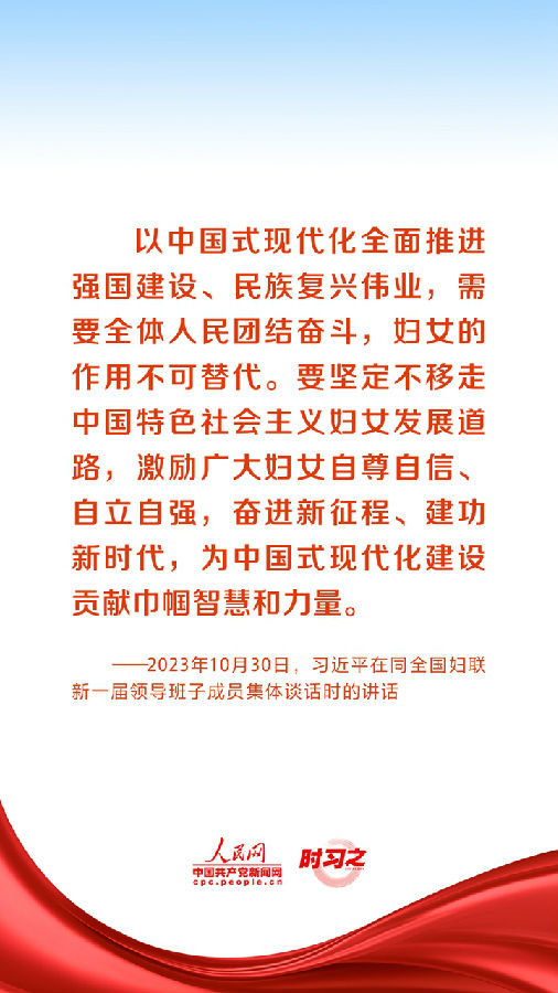 “以中国式现代化全面推进强国建设、民族复兴伟业,需要全体人民团结奋斗,妇女的作用不可替代。”习近平始终关心关怀妇女全面发展、谋划部署推进妇女工作,激励广大妇女书写与祖国共命运、与人民齐奋斗的精彩华章。
